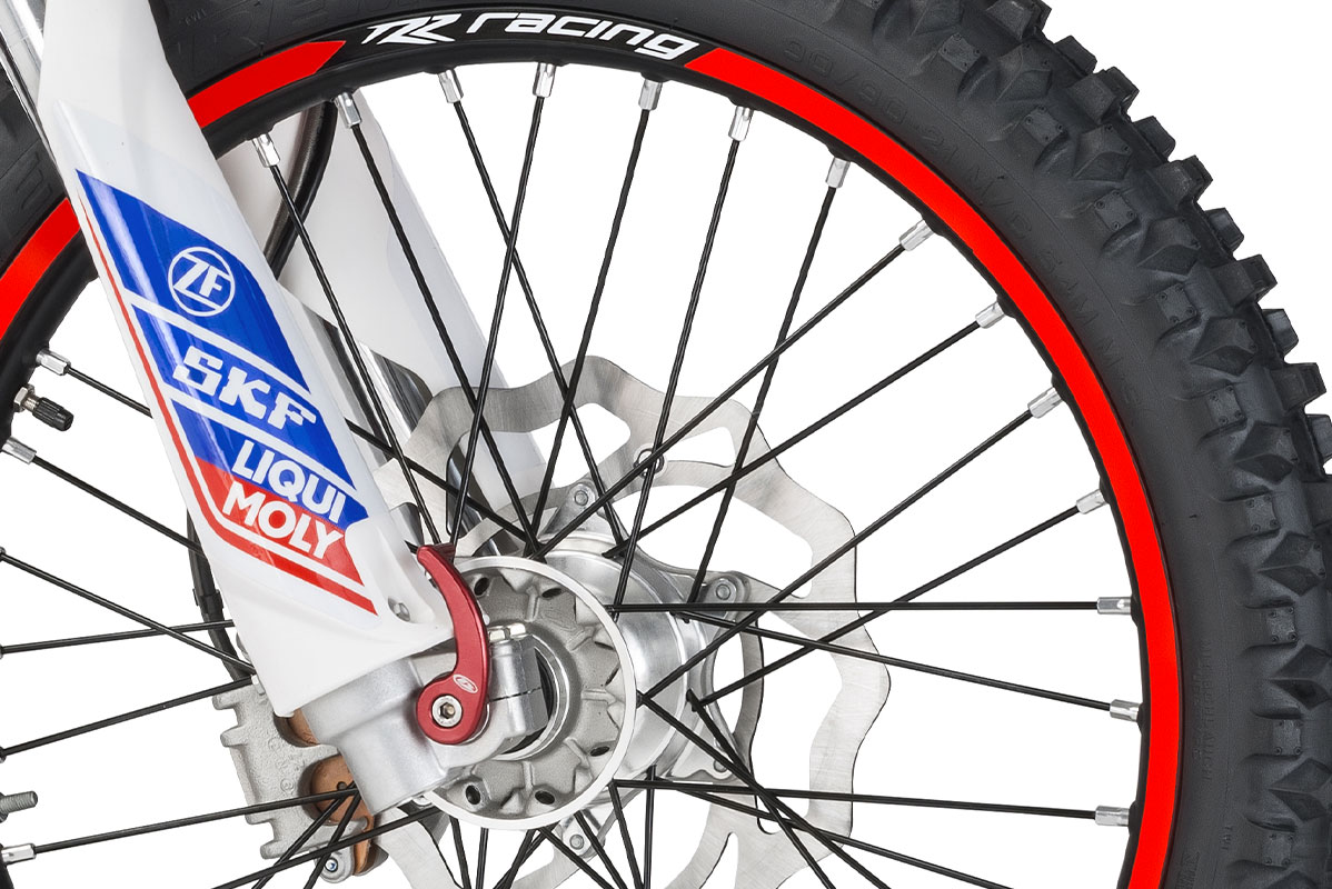 Modelová řada nabízí řadu speciálních součástí. Patří mezi ně například Rychloupínací čep předního kola, který je je nezbytný pro úsporu drahocenných sekund během závodu, a proto urychluje opravy pneumatik. Na kolech jsou dále pneumatiky Metzeler Six Days: pro sebevědomou jízdu v terénu. Není náhodou, že tyto pneumatiky jsou nejčastěji používány v enduro soutěžích nejvyšší úrovně a mnohonásobným mistrem světa Stevem Holcombem. Dalším důležitým komponentem jsou černé stupačky Ergal, se širokou kontaktní plochou a ocelovými kolíky zajišťujícími optimální přilnavost za všech podmínek. Robustní, ale lehká konstrukce znamená, že tyto stupačky mají také delší životnost. O dalších speciálních komponentech se můžete dočíst níže.
